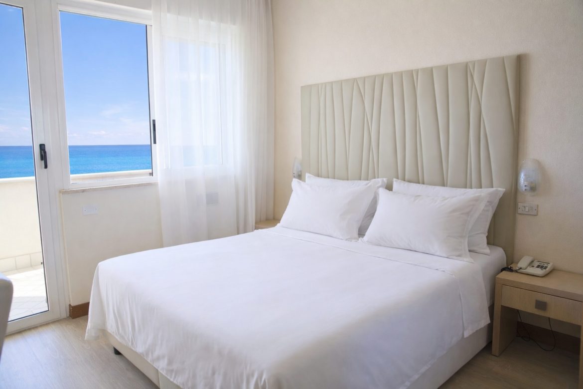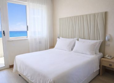 Camera family con balcone sul mare e vista frontale. Composta da una camera matrimoniale 12 mq, una camera singola 8 mq comunicanti tra loro ed un bagno con finestra. Ideale per una famiglia con bambini con la comodità di spazi separati; dispone di un letto matrimoniale ed un terzo letto che può diventare letto a castello.